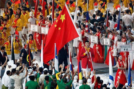 我们非常骄傲中国终于能够举办奥运会,对我们国家来说,这是一个重大的成就。开幕式上,当我们走进鸟巢的时候,我们被欢呼声和呐喊声震惊。我从来没有见过有那么多五星红旗在那里飘扬。在那些欢呼声中,我们获得了力量。那晚之后,我觉得我们可以挑战世界。